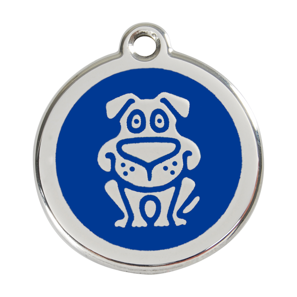 The Red Dingo Stainless Steel & Enamel Happy Dog ID Tag is made of stainless steel and durable enamel.